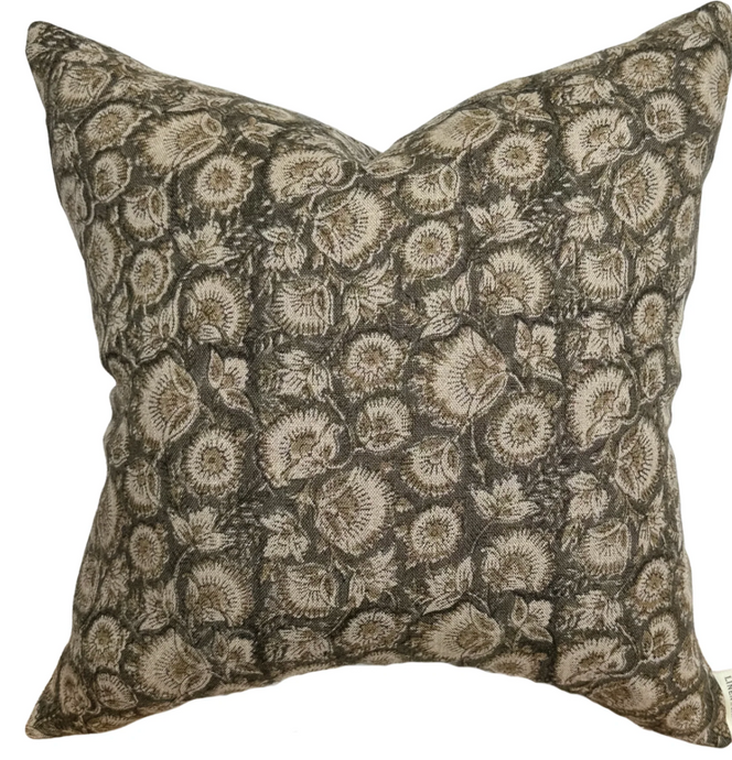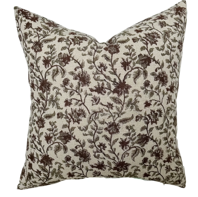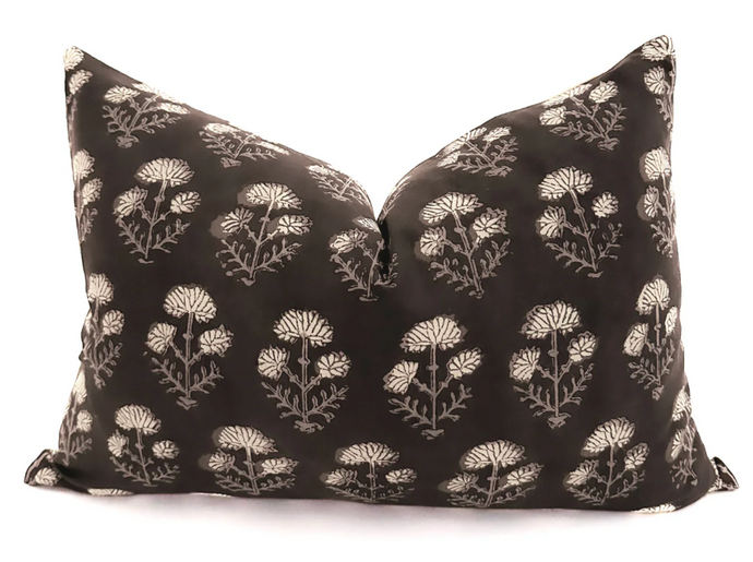 Ivory and Tan Floral Handblock Lumbar Pillow Cover